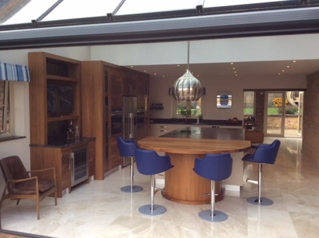 This fabulous kitchen was designed for a barn conversion near Nottingham. The client loved the slatted walnut design which Inglish Design provided and opted to have a large island and sink area in a hand painted finish. The island is simply stunning at a size of 3100mm x 1800mm, with an inset down draft extractor and hob. The island top was supplied in one single slab in Stromboli Leathered Granite, which has an exquisite natural pattern. The island also features a walnut breakfast bar to one end with seating. Additional features were added to the kitchen via integral lighting, and smoked mirror panels. Appliances were integrated throughout the kitchen with the back wall of walnut cabinets housing ovens and a large fridge freezer. In addition there are pull out larders, and a bar area with a wine cabinet and television.